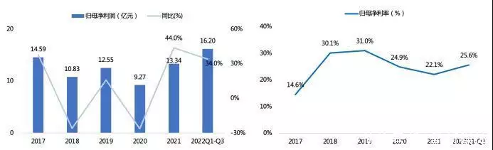 得益于营收规模的高增以及费用率的下滑,2021年,小商品城实现归母净利润13.3亿元,同比增长44%,2022年前三季度,公司实现归母净利润16.3亿元,同比增长34%。从归母净利率来看,2017-2021年公司的归母净利率中枢在24.5%;2022年前三季度,随着毛利率下滑的边际放缓,公司实现归母净利率25.6%,较2021年提升了3.5个百分点。< style="text-align: left; margin-bottom: 10px;">