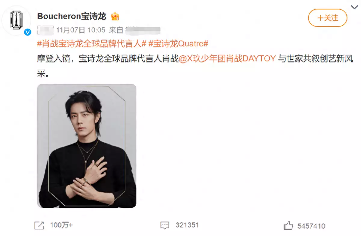 11月7日,全球顶级奢侈品牌宝诗龙官宣肖战为其全球品牌代言人,有网友提及,肖战是没有所谓的考察期,直接由品牌官宣成为全球品牌代言人的,可见其影响力。