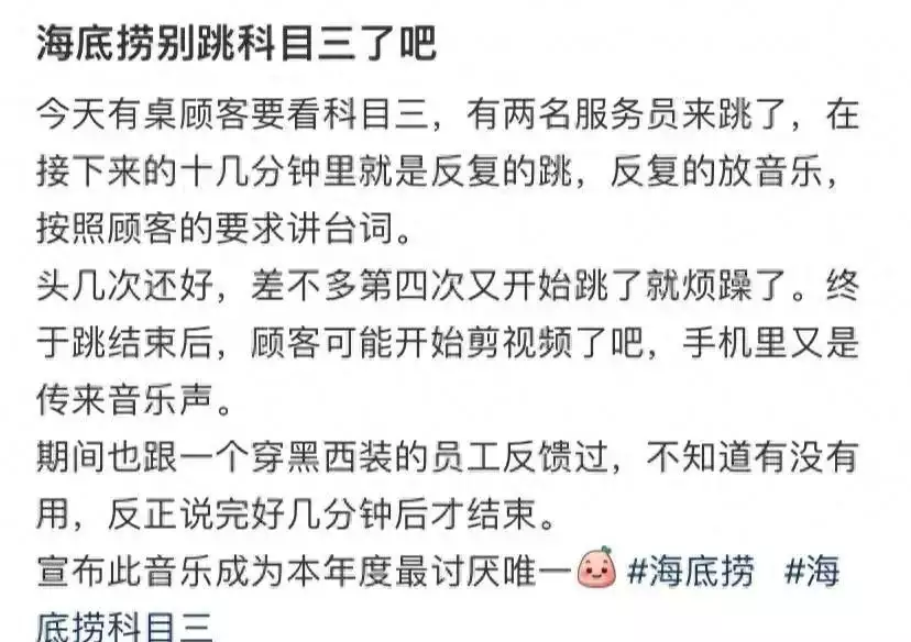 在正处话题流量和争议质疑的风口浪尖之际,有网友发现,如今有些海底捞门店已经不让跳“科目三”了。