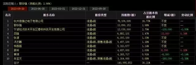 2023年三季报显示,郭华强目前为信雅达实际控制人,持股比例2.98%。公司第一大股东为杭州信雅达电子有限公司,持股比例为16.73%,郭华强持有该公司75.32%股份。