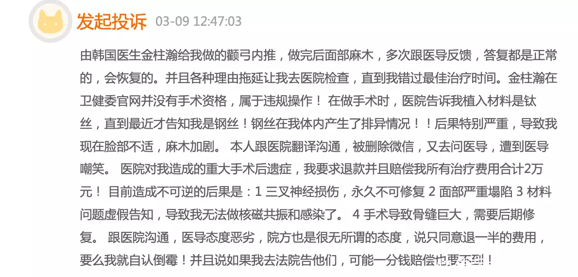 今年三月份的一则投诉显示,一位消费者在友谊整形手术后,导致“神经永久损坏”,手术过程中遭遇“各种理由拖延”,导致消费者“错过最佳治疗时间”,而且主治医生“在卫健委官网并没有手术资格,属于违规操作”。另外在后续沟通中,院方态度“恶劣”。