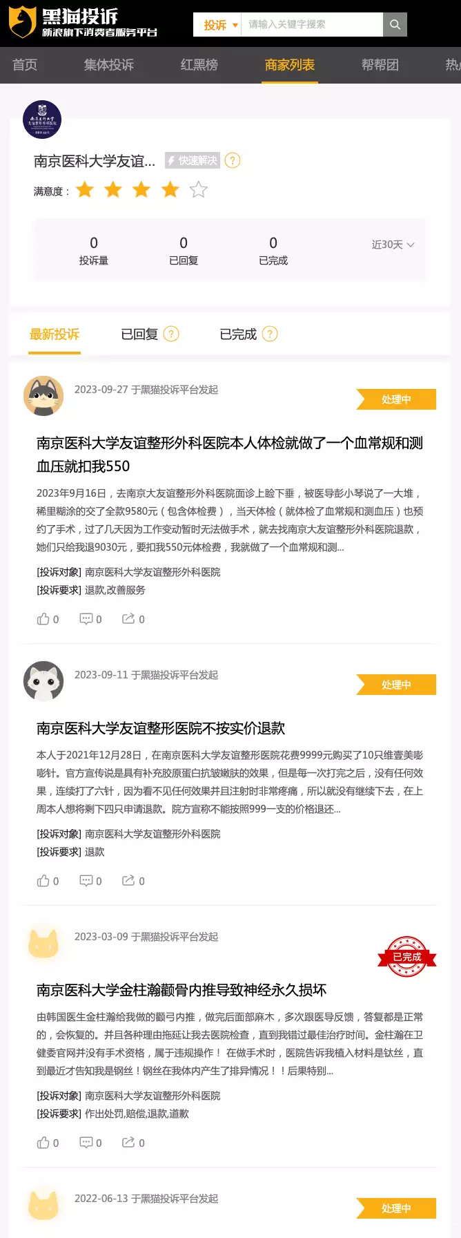以新浪旗下消费者服务平台黑猫投诉为例,近期,友谊整形接连收到消费者投诉,涉及乱收费、售后退款、医疗事故等种种问题。