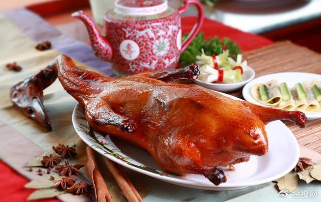 北京烤鸭起源于中国南北朝时期,《食珍录》中已记有炙鸭,在当时是宫廷食品,其用料为优质肉食鸭北京鸭,果木炭火烤制,色泽红润,肉质肥而不腻,外脆里嫩。