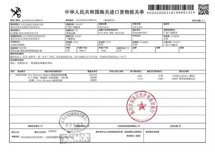高先生说,儿子发现该鱼油疑似为假货,“我们查询鱼油包装盒上的防伪二维码后,发现这个二维码是一个企业自建的网站山寨防伪平台,且根据商家提供的报关单进行查询,发现查询不到有关订单的任何通关信息,报关单的通关状态在2021年5月10日时就已结关,但商家提供的报关单中显示的‘申报日期’和‘进境日期’均为2023年10月10日。”