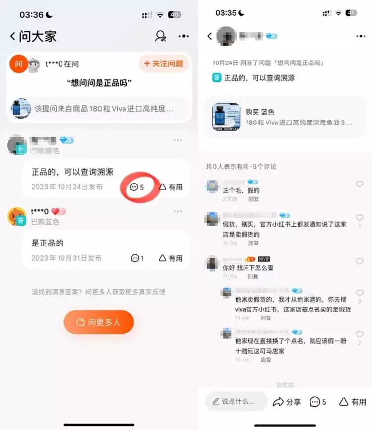 综合以上查验结果,高先生认为该商家出售的鱼油为viva naturals鱼油的假冒商品。他说,他在买家评论中发现,有网友于11月4日对该鱼油进行评论,表示该店铺曾被viva官方点名销售假货后直接换了个店名重新开店,该店铺所售的鱼油为假货。