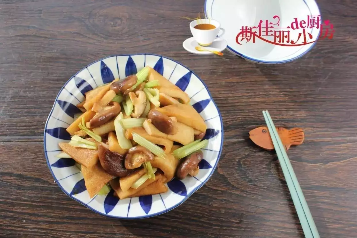 原料:西芹 2片 香菇 4朵 千叶豆腐 1块 生抽 1勺 油 盐 适量