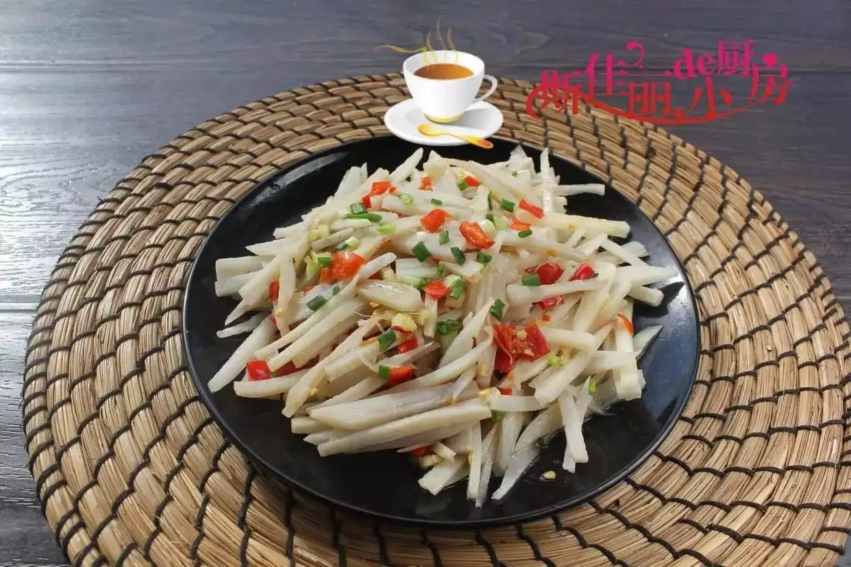 制作:1. 将茭白的外皮剥去,洗净后切成细丝备用;
