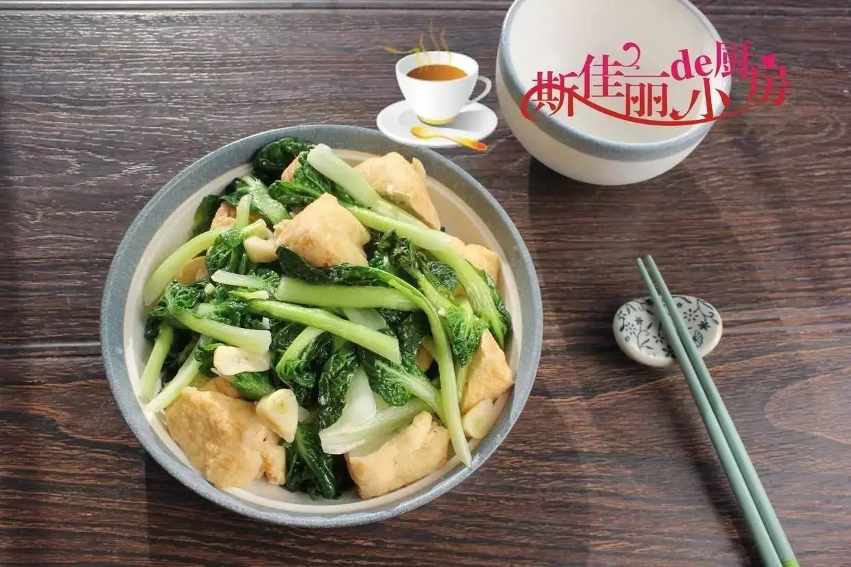 原料: 乌塌菜 1颗 豆腐泡 1小盘 蒜 3瓣 油 盐 适量