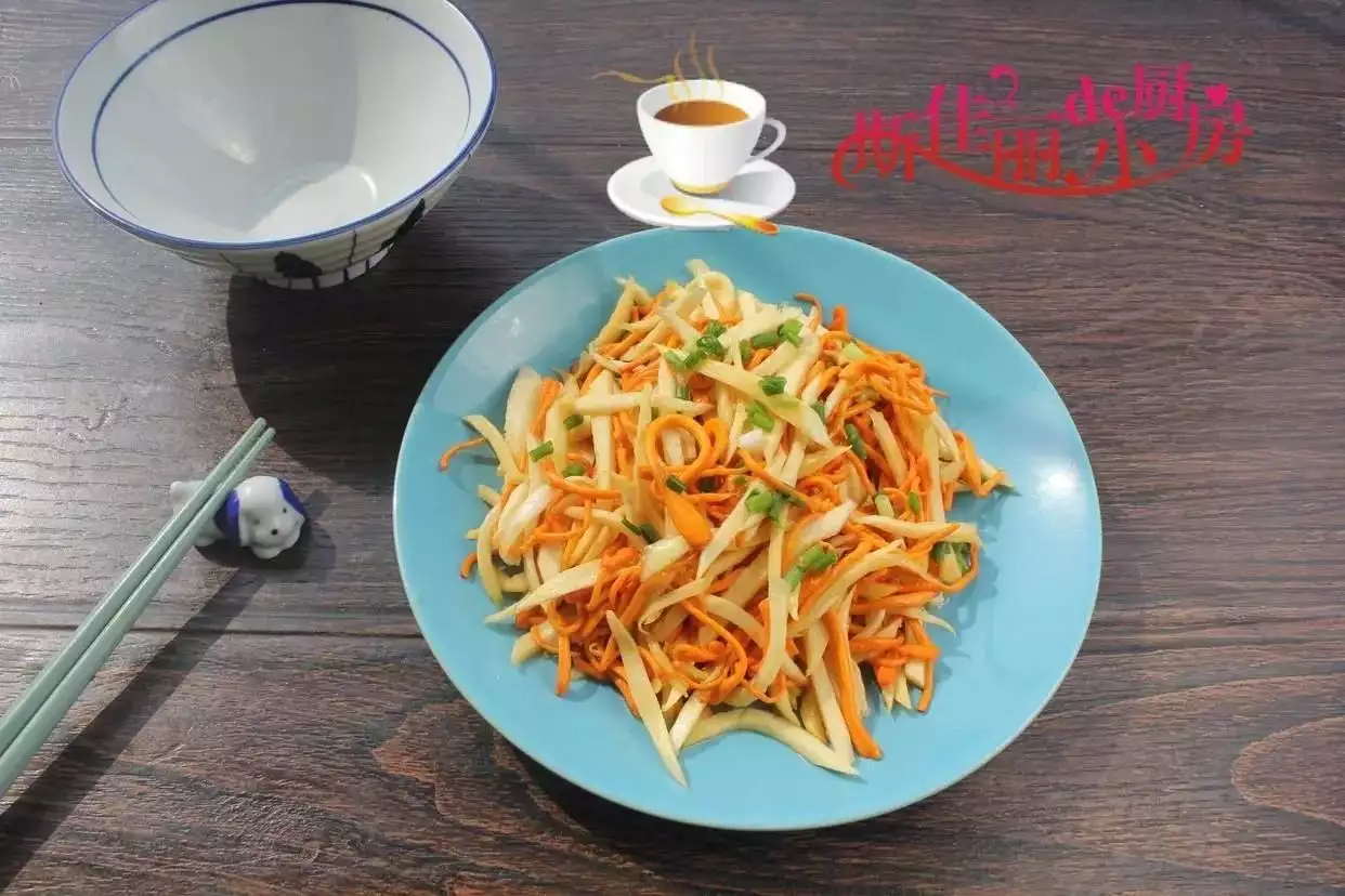 制作:1. 将莲藕去皮后切成细丝备用,注意莲藕丝切好后要尽快炒,避免放置时间过长氧化变色,如果不能马上炒,就放入加了白醋的清水浸泡,这样能保持莲藕的色泽洁白;