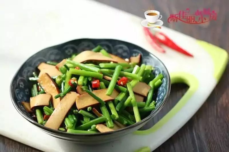 原料: 韭菜薹 1把 鸡蛋干 1块 红椒2个 油 盐 适量