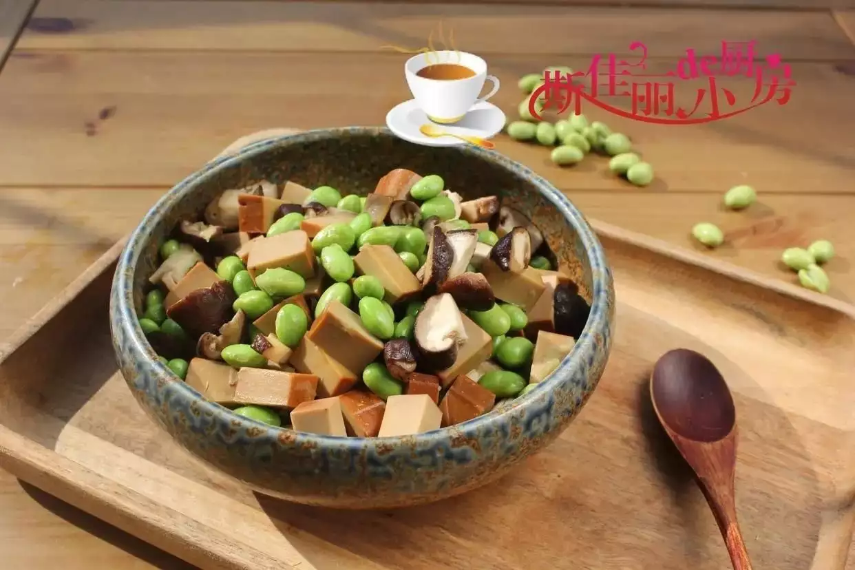 原料:鸡蛋干 1块 香菇 5朵 毛豆米 1小碗 油 盐 适量