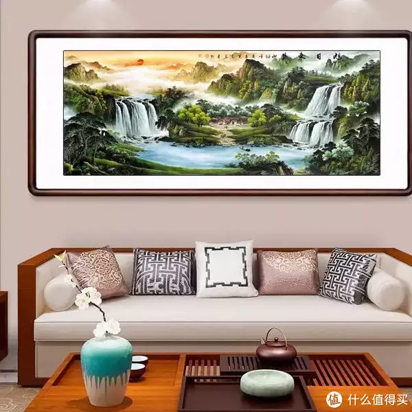 在办公室也可以悬挂一些山水画,比如眼前的积善山水画,就会让人觉得有一种磅礴的气势,远处的高山,远处的瀑布,还有远处青翠欲滴的树木,全部出现在这一个画面上,总会让人觉得很是精致,有一种栩栩如生的感受。