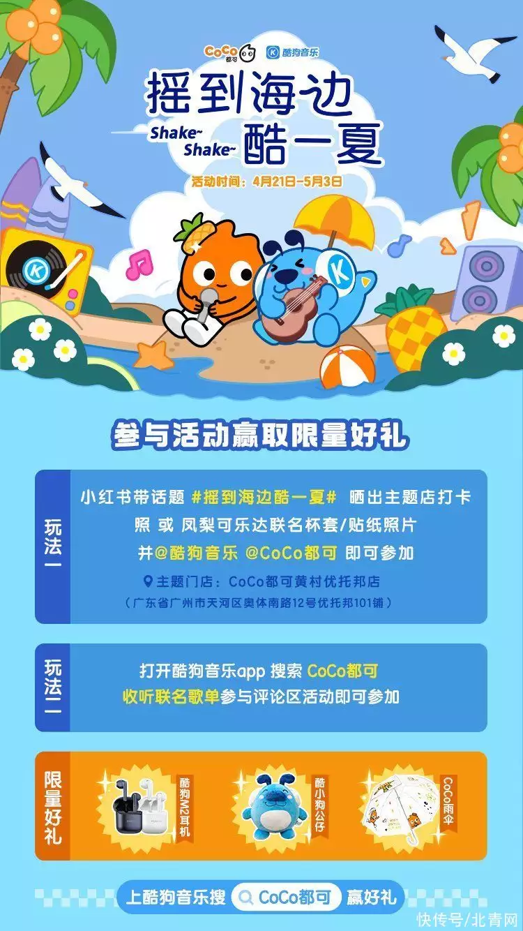 送别春日最后一个节气谷雨,即将迎来热情似火的夏日,此时的广州的气温早已冲破了30度。当夏日来临,没有什么比醉人的海滩更充满吸引力。酷狗音乐携手CoCo都可推出“摇到海边酷一夏”联名活动,打造定制款夏日饮品、夏日酷礼、夏日歌单,shake一下就能带你穿越到椰林树影的夏日海滩,体验夏日的味道。