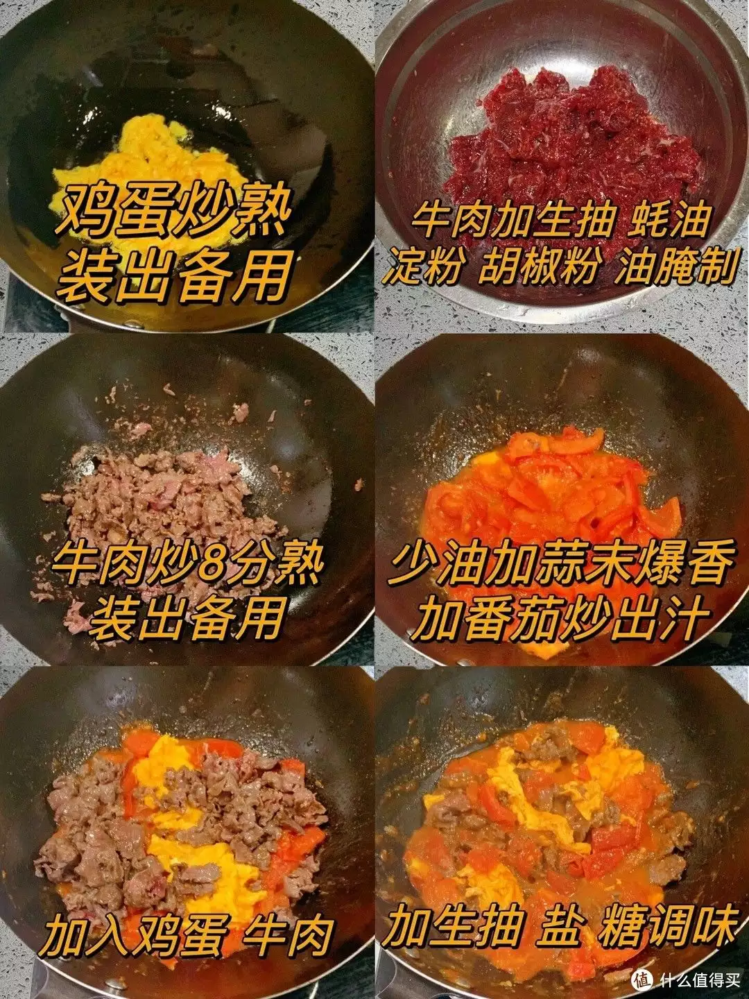 让我们来看一下具体的制作步骤。首先,将牛肉切成薄片,用盐、胡椒粉和生抽腌制片刻。这样可以使牛肉更加入味。然后,将番茄切成小块备用。鸡蛋打散成蛋液备用。 接着,热锅加入适量的油,待油热后将腌制好的牛肉放入锅中煎至两面金黄。这样可以保持牛肉的嫩滑口感。然后将煎好的牛肉盛出备用。 在同一个锅中,加入适量的油,倒入切好的番茄块翻炒均匀。番茄炒至软烂时,加入适量的糖调味,使番茄汁更加浓郁。然后,将煎好的牛肉放回锅中,与番茄一起翻炒均匀。最后,将打散的鸡蛋液倒入锅中,快速翻炒均匀,使鸡蛋与牛肉、番茄充分融合。