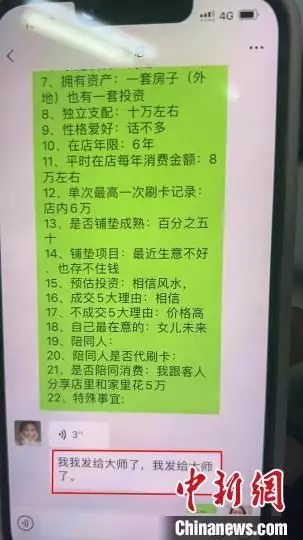 警方表示,部分引流人员不仅提供个人信息,甚至给所谓“大师”提供有针对性的行骗方案。40岁朱女士也是被害人之一,直到被警方告知,她还对被美容店“好友”出卖一无所知。警方表示,朱女士个人的隐私信息被整理成22条,包括了个人、职业、家庭、财务等各类信息,细致到与丈夫已分居三年,还在为婆婆状告170万元的民间借贷应诉等细节,“好友”甚至明确对所谓“大师”表示:“给她一项一项上,骗个8到20万左右”。