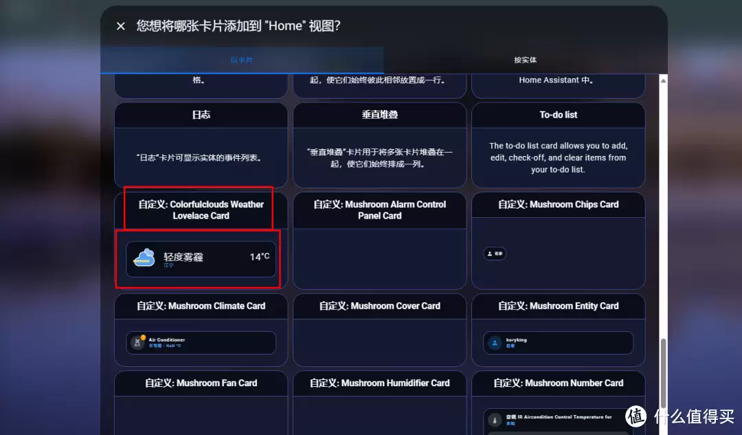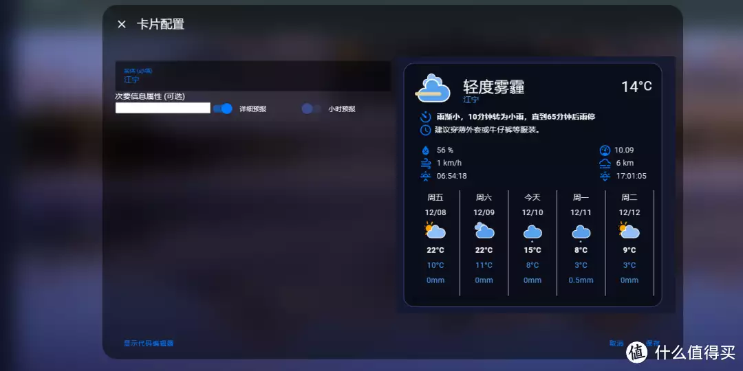 彩虹天气则需要通过HACS下载一个天气预报和一个Colorfulclouds Weather Card的插件。