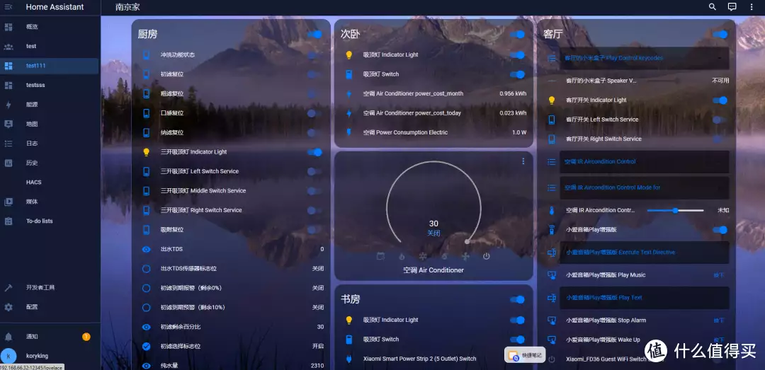 当然,现在的主题也仅仅只是改了下背景图,背景颜色,更漂亮的定制化主题,需要自己去论坛或者github找其他大佬更深层的教程了(忠告:玩其他大佬的定制化主题之前,一定要把自己当前homeassistant docker目录下的文件全部进行备份,防止玩崩了重新恢复)。
