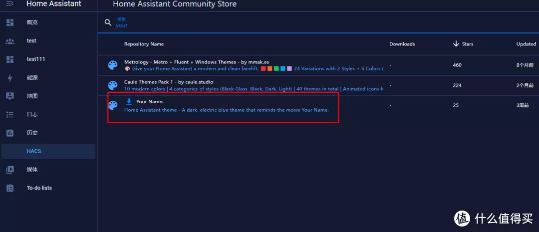 我这里以一个比较简单的主题举例,我们打开HACS商店,先清除右上角已经筛选的项,再点击三个横杠,选择theme,搜索your name(因为我实验了好多个主题,就这个可以更换背景图)。