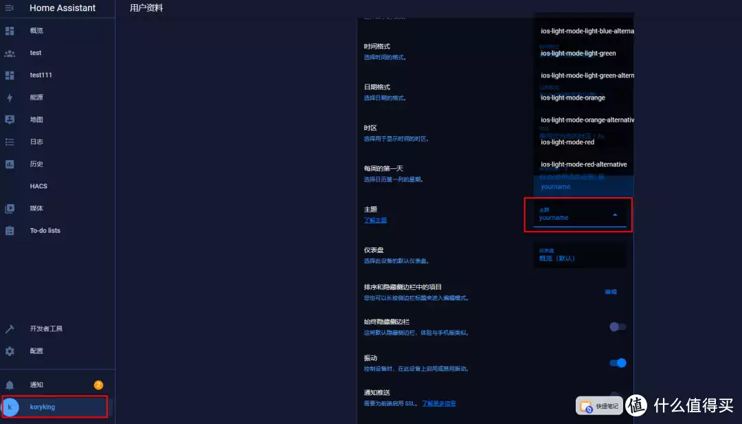 重启HA,并点击个人的头像,选择yourname主题。