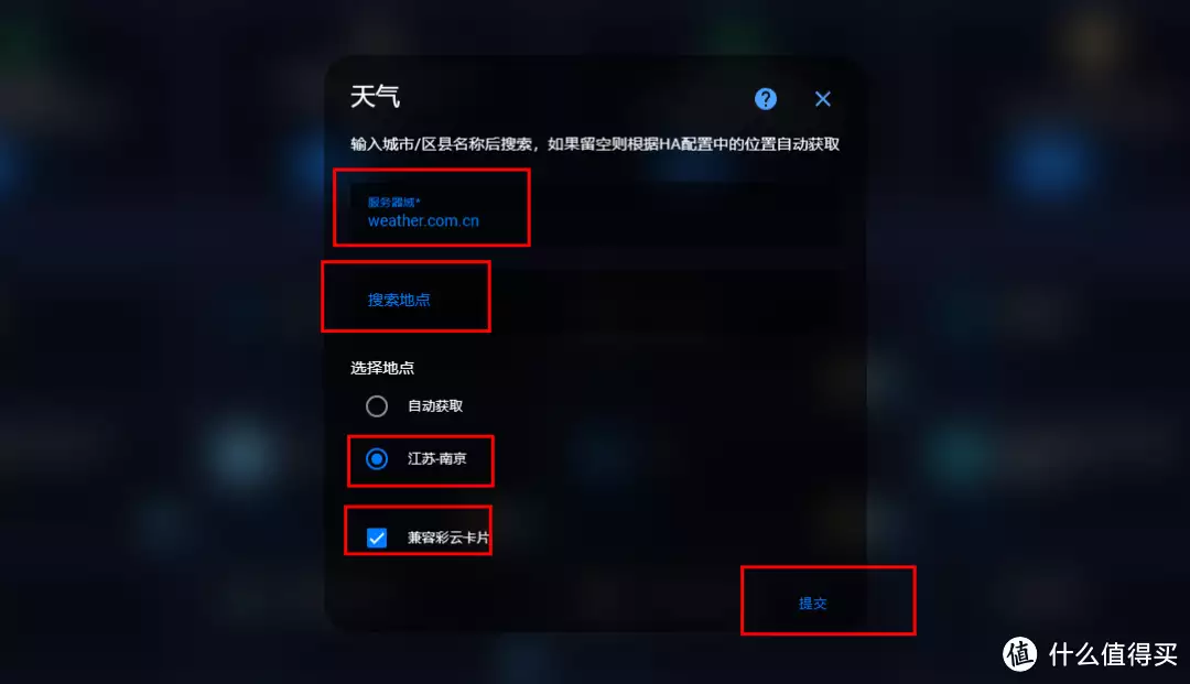 服务器填入weather.com.cn,填入地点进行搜索,选中搜索结果,勾上兼容彩云卡片,点击提交。