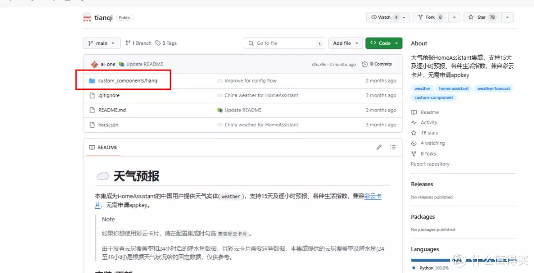 如果天气预报在HACS中无法直接找到的话,则到github如下连接中,自行下载上传重启,来进行安装。