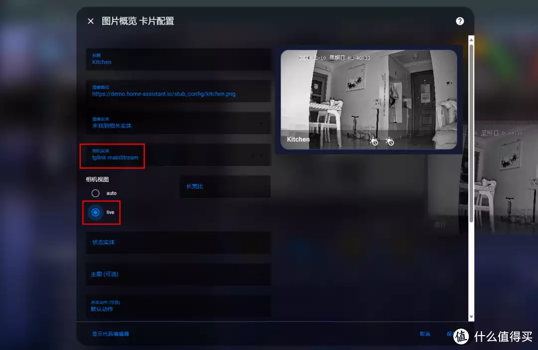 选择相机实体,并将相机视图选择为live,点击保存,即可将摄像头添加到仪表盘了。