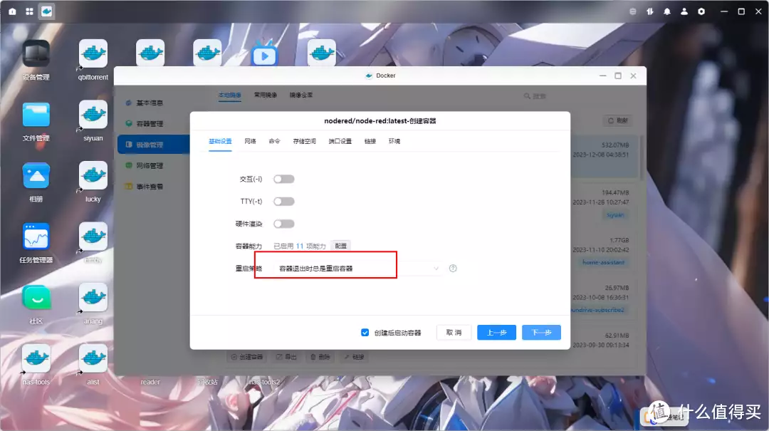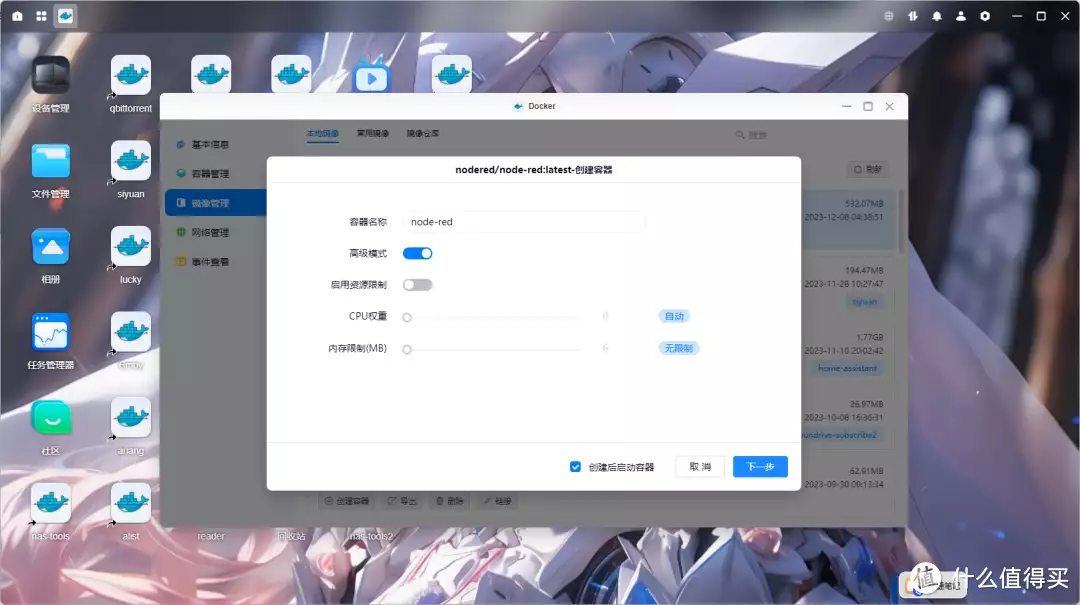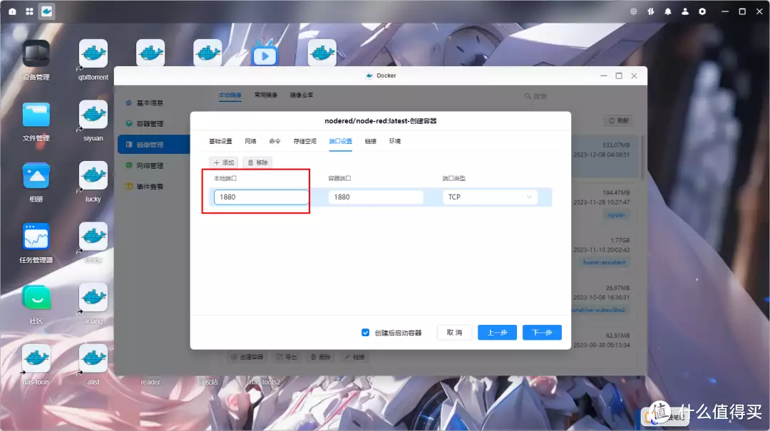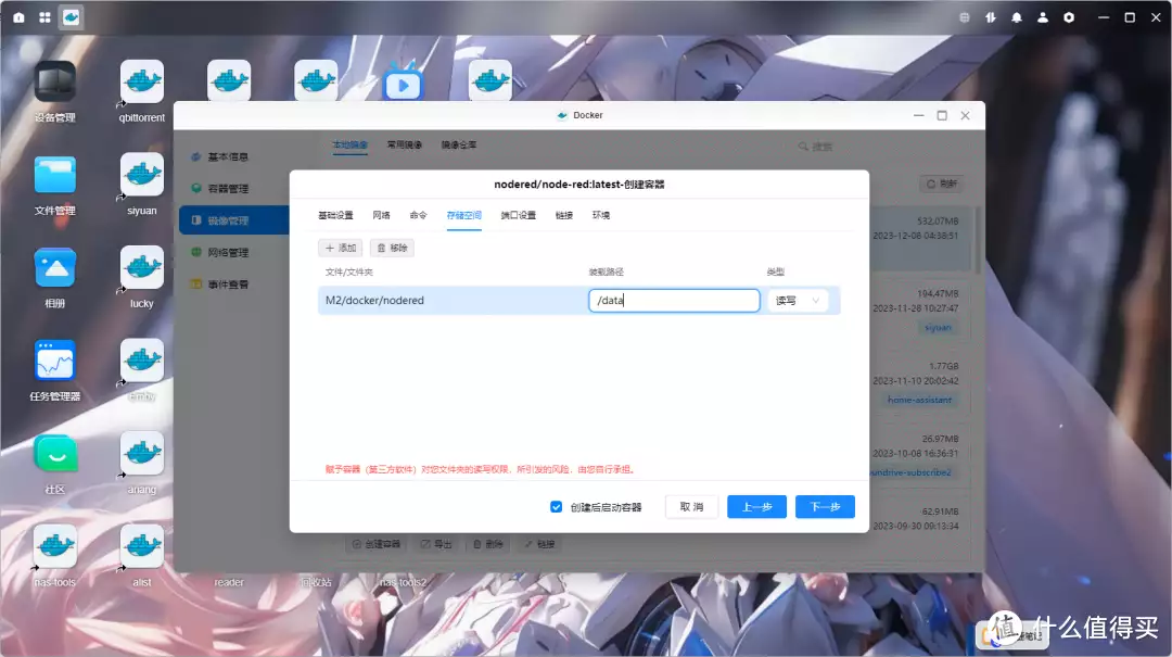 在docker目录下新建一个nodered的目录,选择并装载到/data,注意类型为读写。