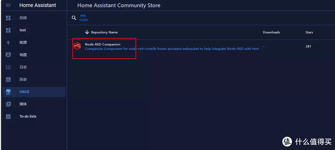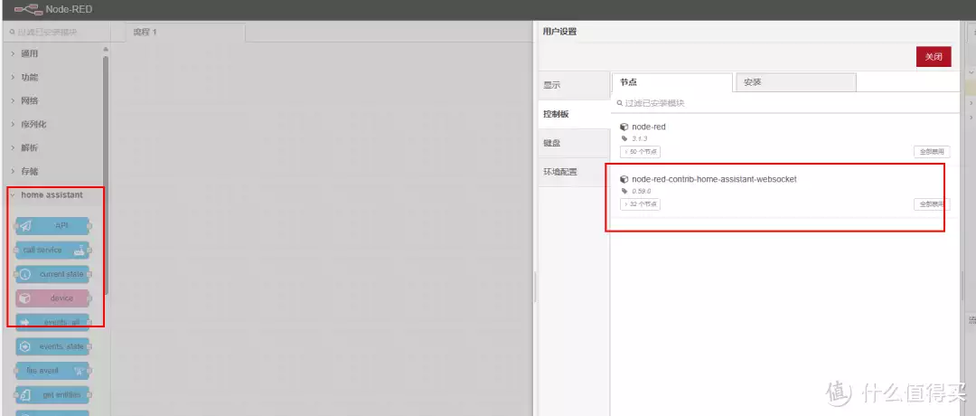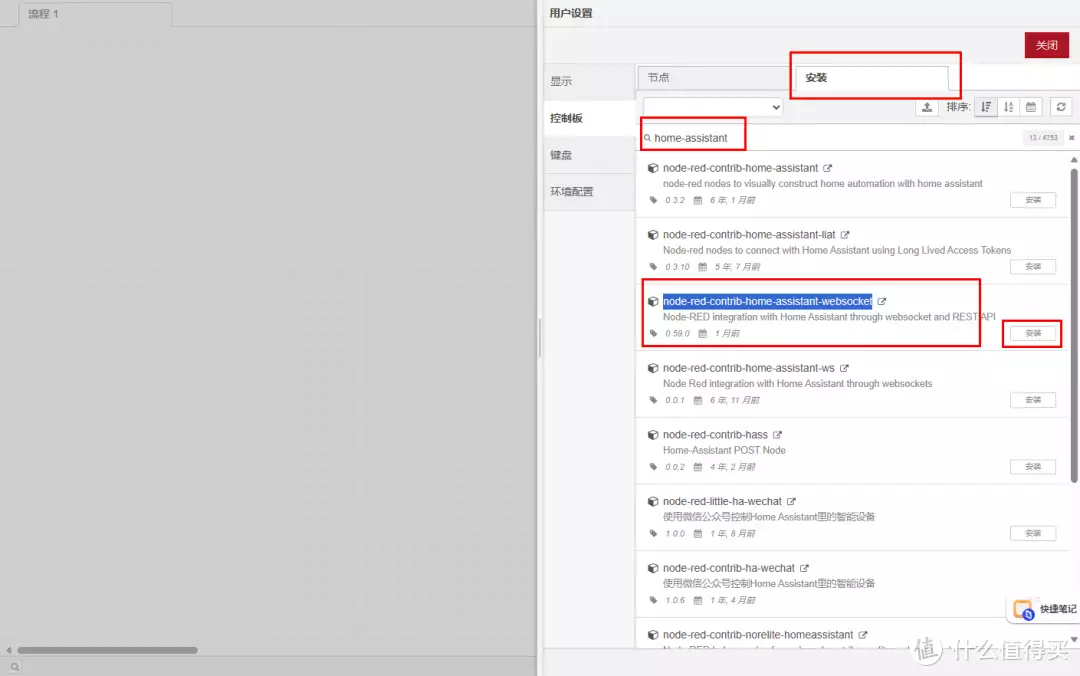 在控制板中点击安装,搜索框中输入node-red-contrib-home-assistant-websocket,点击安装。