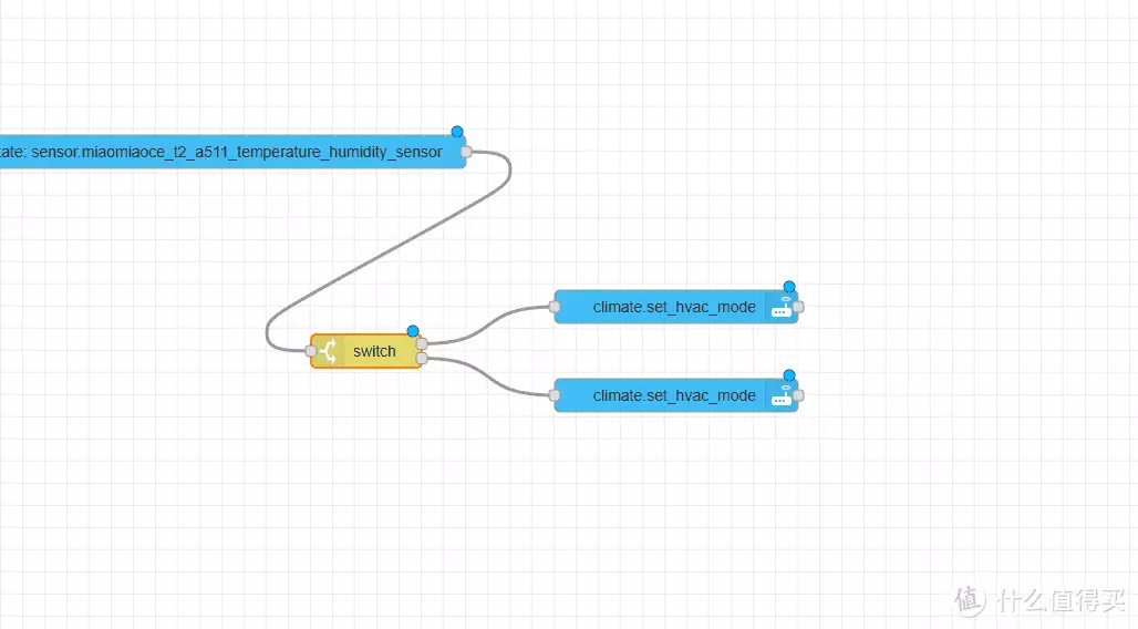 node-red想要学精通非一朝一夕,下面就以一个联动场景:通过开灯触发打开空调并根据当前房间温度判断使用制冷还是制热模式,给大家简单简单的介绍下node-red怎么使用的。我们首先要把我们想要实现的场景,大概在脑袋里过一遍,形成一个流程图,比如我这个场景,首先我们是通过开灯进行触发>再获取房间的温度>然后根据温度情况做一个判断>最后是根据判断结果进行空调模式的切换,流程明确之后就很简单了。。