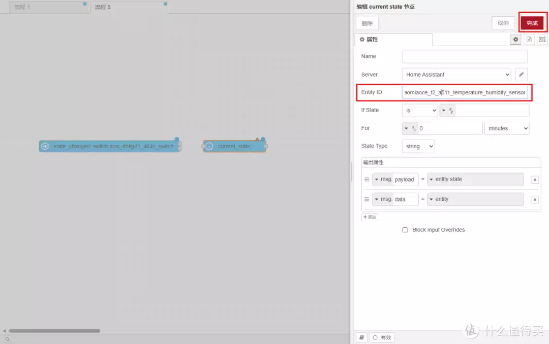 接下来获取当前书房温度,从左侧拖入current_state组件,双击进行编辑,从HA的设备与服务找到温湿度计对应温度的实体id,填入entity id中,这里if state后留空即可,点击完成。