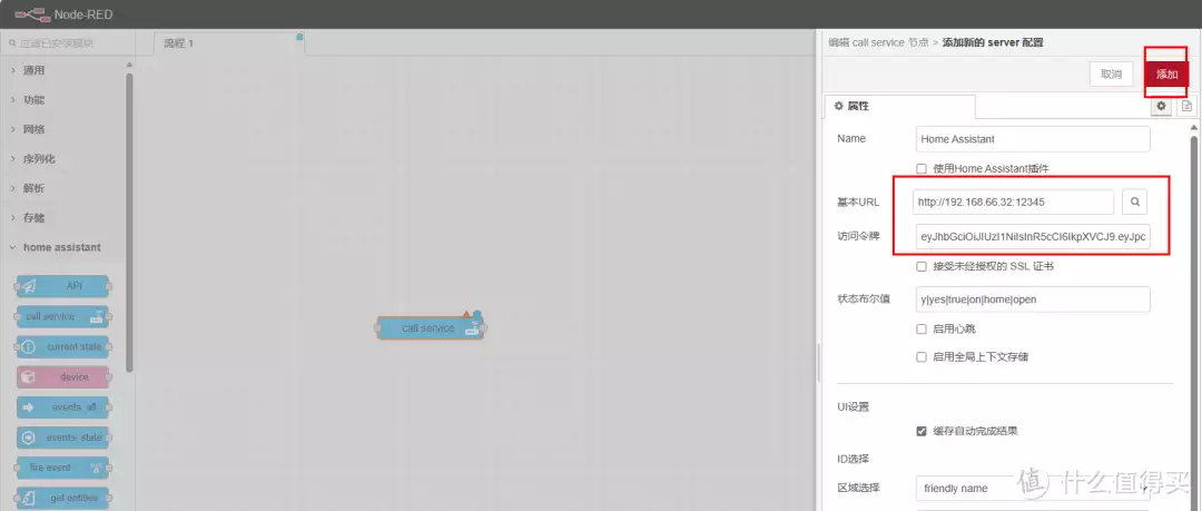 填入HA的环境信息(如:http://192.168.66.32:12345)和刚才获取的长期令牌,点击添加,再点击完成。