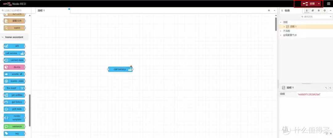 将swtich灰色小框连到对应的call service组件上,从上往下,第一个组件对应的就是swtich内配置的第一个条件,第二个就是第二个条件,以此类推,至此,这个流程就配置完了,记得点一下右上角的部署进行保存和应用。