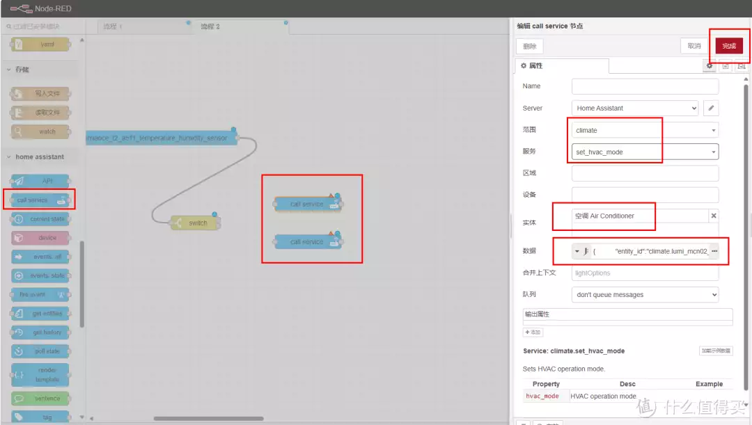 接下来从左侧的homeassistant组拖入两个call service组件,双击进行编辑,范围选择climate,服务选择set_hvac_mode,选择书房空调的实体,数据内填入以下内容,entity_id填入空调的实体id,hvac_mode对用制热的组件就填入heat,对应制冷的那个组件就填入cool: