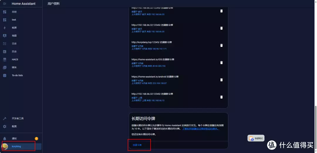先回到homeassistant页面,点击左下角的管理员用户名,往下翻找到长期访问令牌,点击创建令牌。