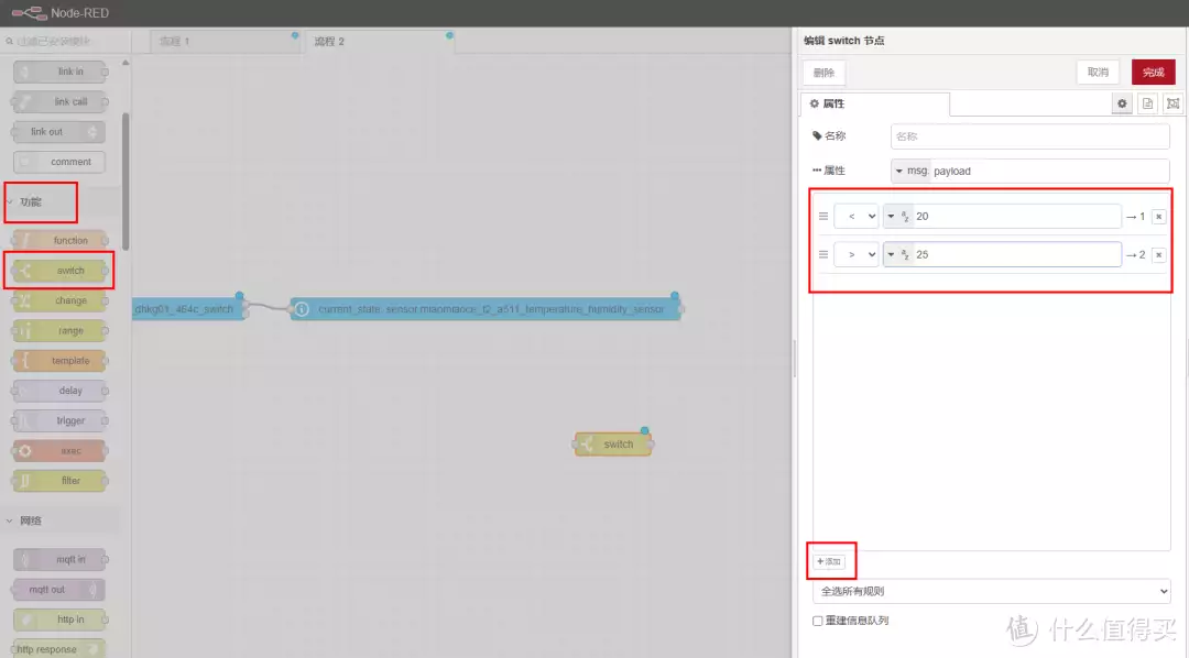 接下来是进行判断,从左侧功能组拖一个switch到流程中,双击进行编辑,点击弹窗下方的添加,第一个条件填入25作为制冷判断条件,点击完成,将第二个组件右侧的灰色方块和switch左侧连接。