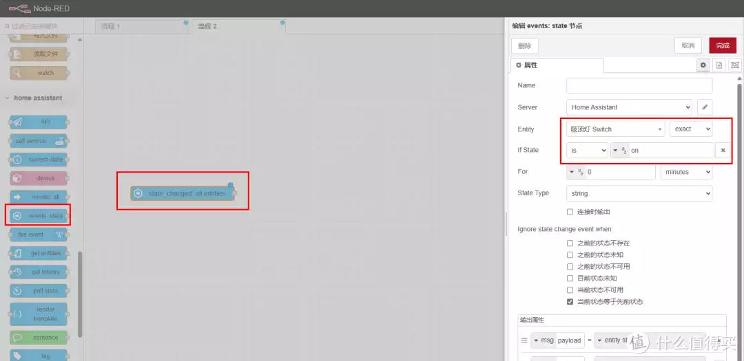 先从左侧homeassistant组里把events:state拖进来,双击进行编辑,entity选择书房灯开关,if state后填入on,判断开灯的状态变成on则进行触发后续事件。