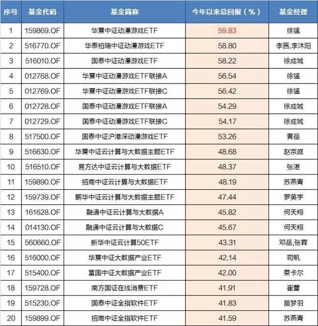另外,回顾一季度板块涨势出现分化,chatGPT带动的人工智能、中字头的“中特估”、半导体等板块涨势如虹,也带动了游戏、云计算、大数据等指数ETF的产品表现神勇,有8只被动指数基金涨幅超50%,分别为华夏中证动漫游戏ETF、华泰柏瑞中证动漫游戏ETF、国泰中证动漫游戏ETF、国泰中证沪港深动漫游戏ETF等,其中华夏中证动漫游戏ETF涨幅59.83%。