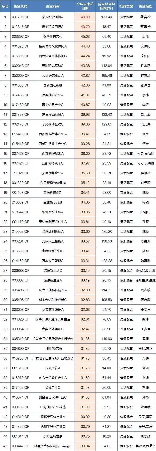 从主动权益基金一季度的业绩情况看,45只主动权益类基金涨幅超30%,排在前列的产品多重仓了TMT板块,其中,蔡嵩松管理的诺安积极回报以49.90%的收益登顶,唐能管理的银华体育文化和文仲阳管理的招商体育文化休闲紧随其后(见下详表)。