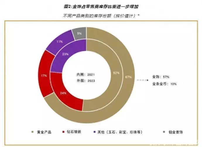 报告显示,就黄金产品品类而言,古法金饰是零售商库存中占比最大的黄金品类,占总库存近28%;普货金饰占据了24%的份额。另外,因不断上升的受欢迎程度,零售商库存中的硬足金饰品也占据了重要地位,达到23%。