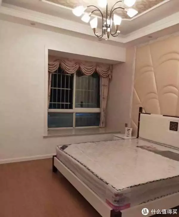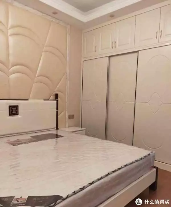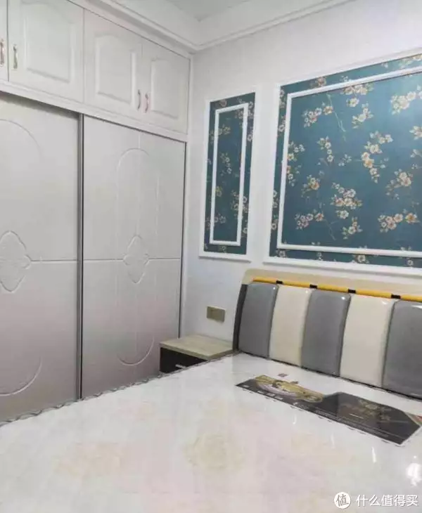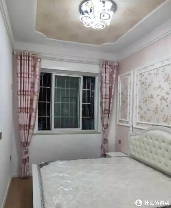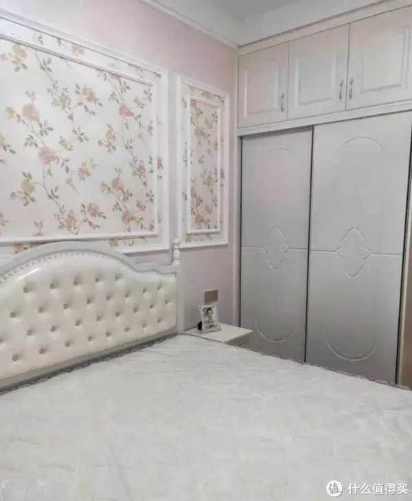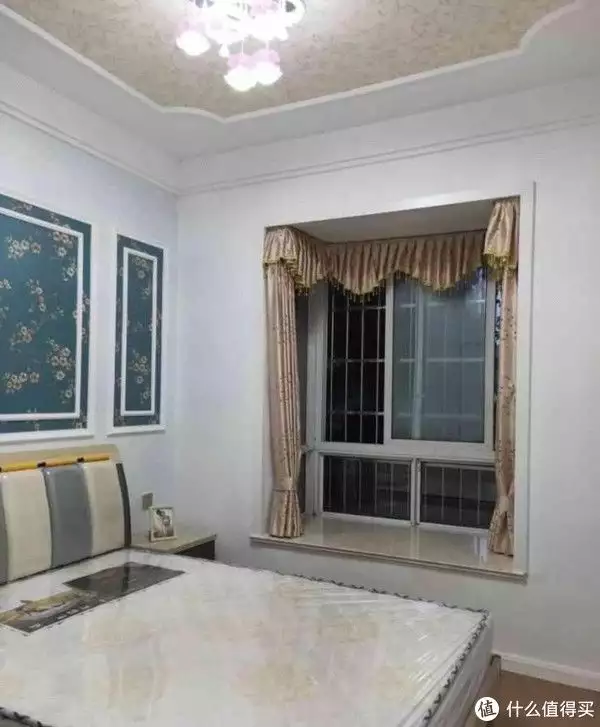 这边是次卧,效果比主卧更清爽一些。天花板也贴了墙纸装饰,床头背景墙没有做软包,倒是做了石膏线条和墙纸。和主卧室一样,次卧也装了一个飘窗。