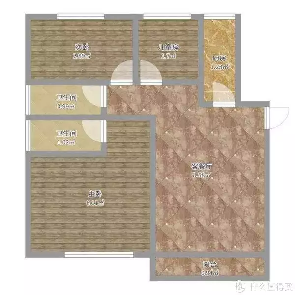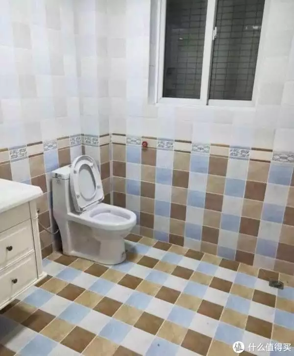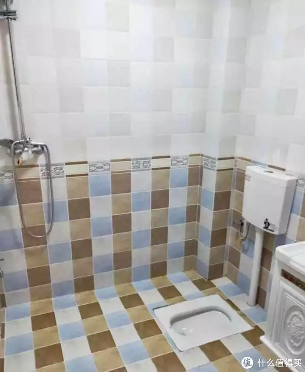 最后我们来看看客卧,和主卧室一样贴了彩色瓷砖。客卫装的是蹲坑,干净实用,连干湿分离隔断都省了。