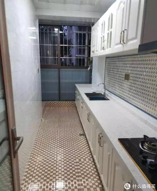 一字型厨房,空间很狭长。工作台的墙壁和瓷板都是马赛克瓷砖,时尚又耐脏。厨房装了白色的橱柜和吊柜,收纳功能很不错的!