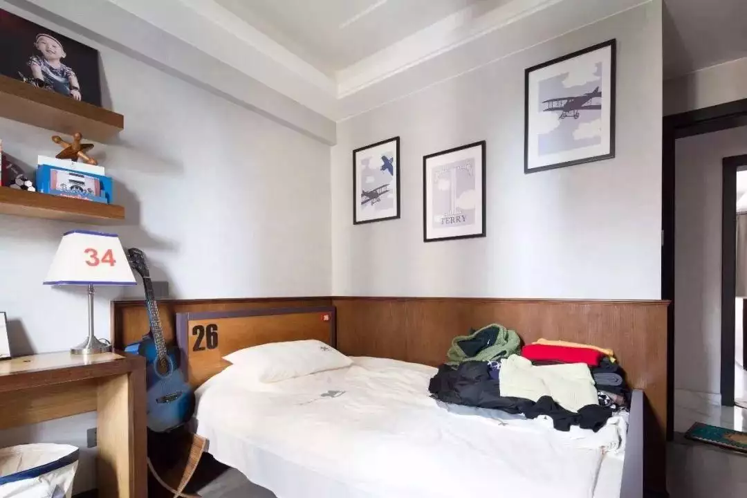 ▲床两侧靠墙,墙脚区域装上护墙板,侧边墙面挂三幅飞机图案的装饰画,也让儿童房显得独特自然。