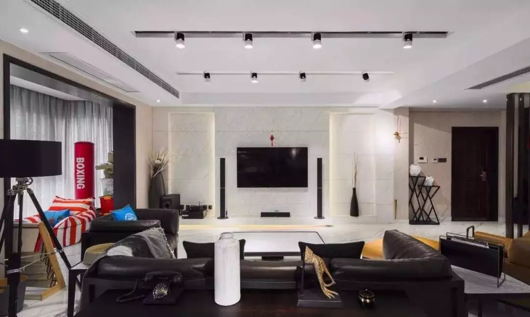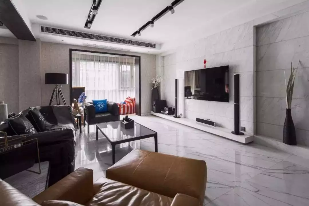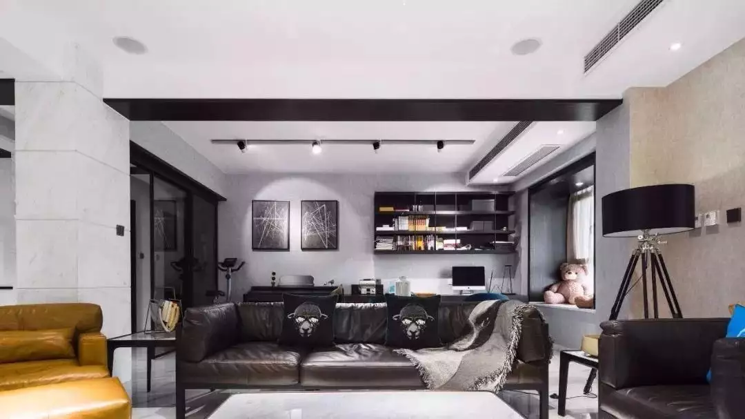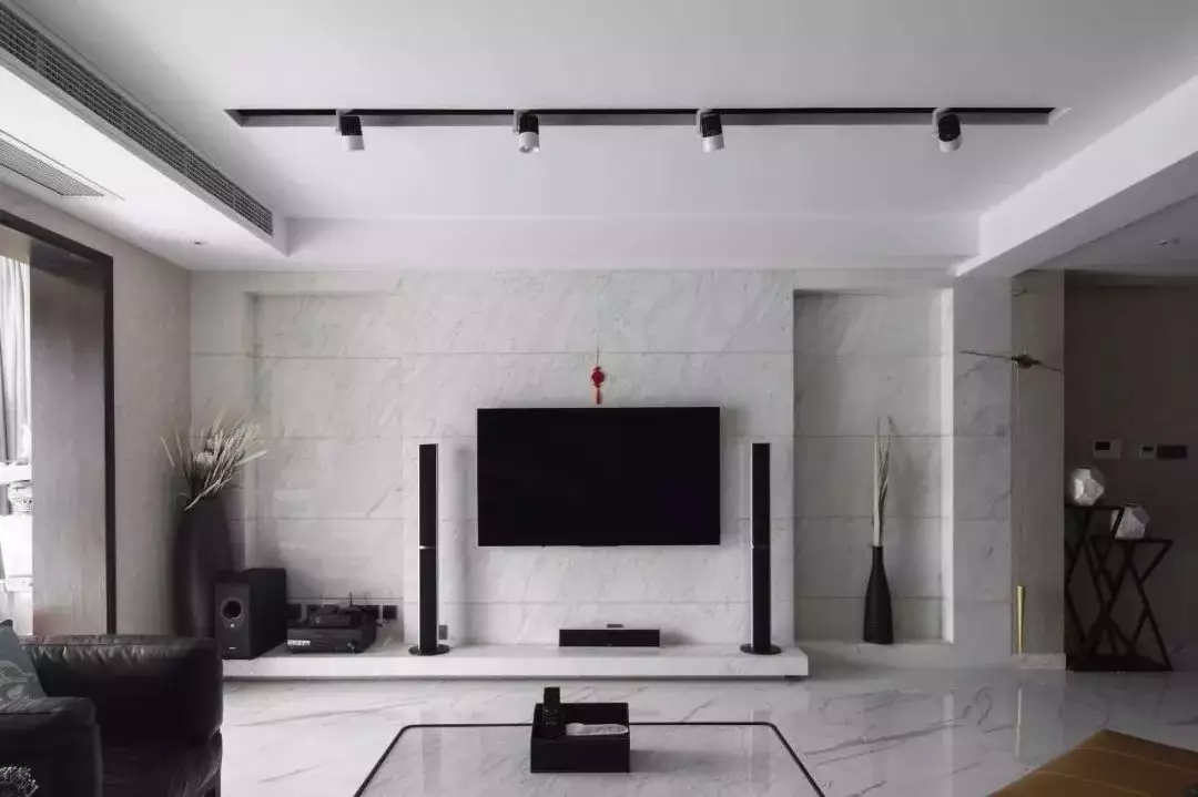 ▲客厅现代风的空间,天花吊平顶+导轨同等的设计,白色电视墙搭配深色沙发家居,营造出一种简雅高级的现代空间感。