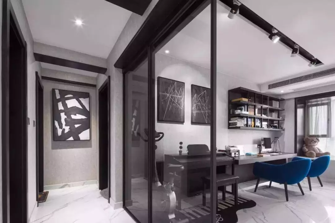 ▲书房是半开放式的空间,设在客厅沙发后,在过道与书房之间装一扇玻璃推拉门,书房里布置双人书桌与钢琴,搭配两张蓝色椅子,墙面挂两幅黑色底+线条的装饰画,在雅白的地砖空间下,显得时尚端庄而优雅。