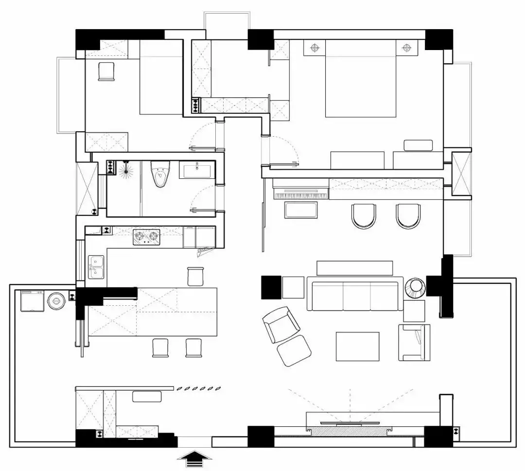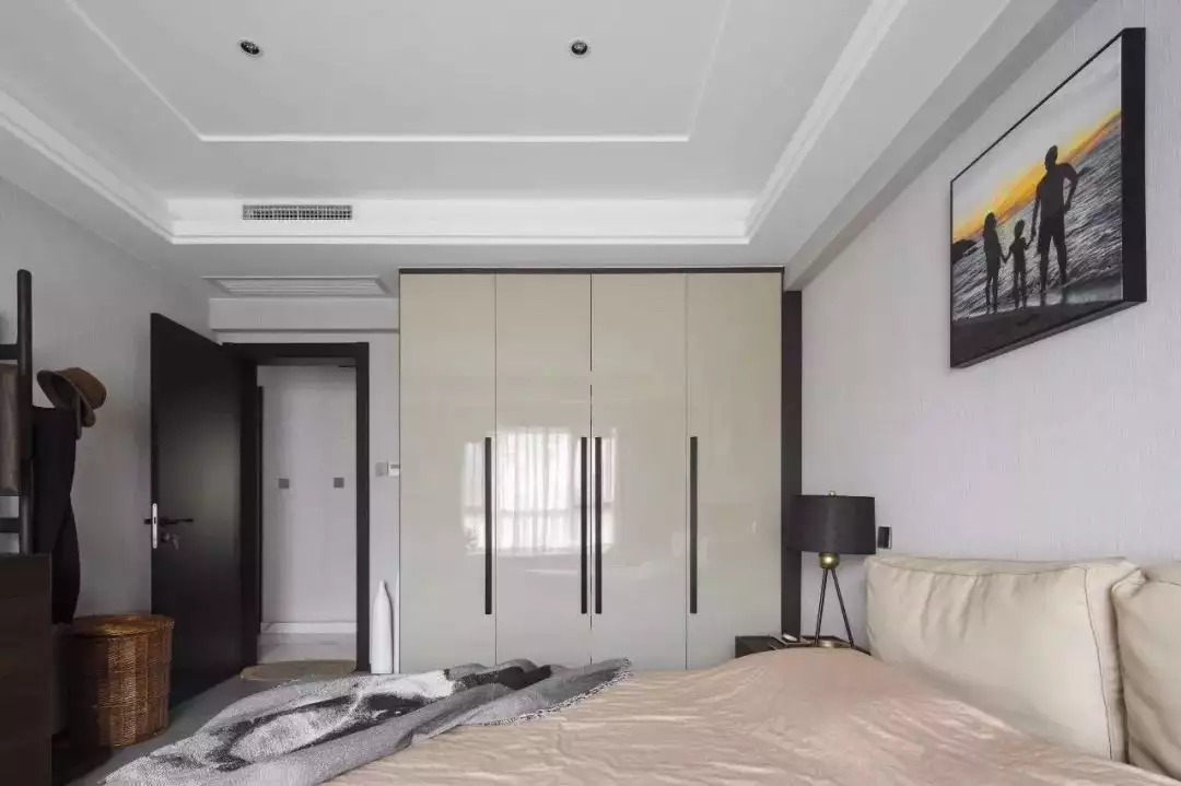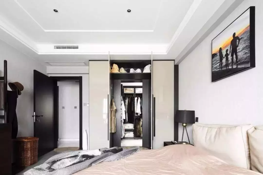 ▲问题天花同样是无主灯设计,四周凸吊顶+中间吊平顶的筒灯组合,黑色房门与衣柜,黑白配的设计让空间显得端庄现代而高级。