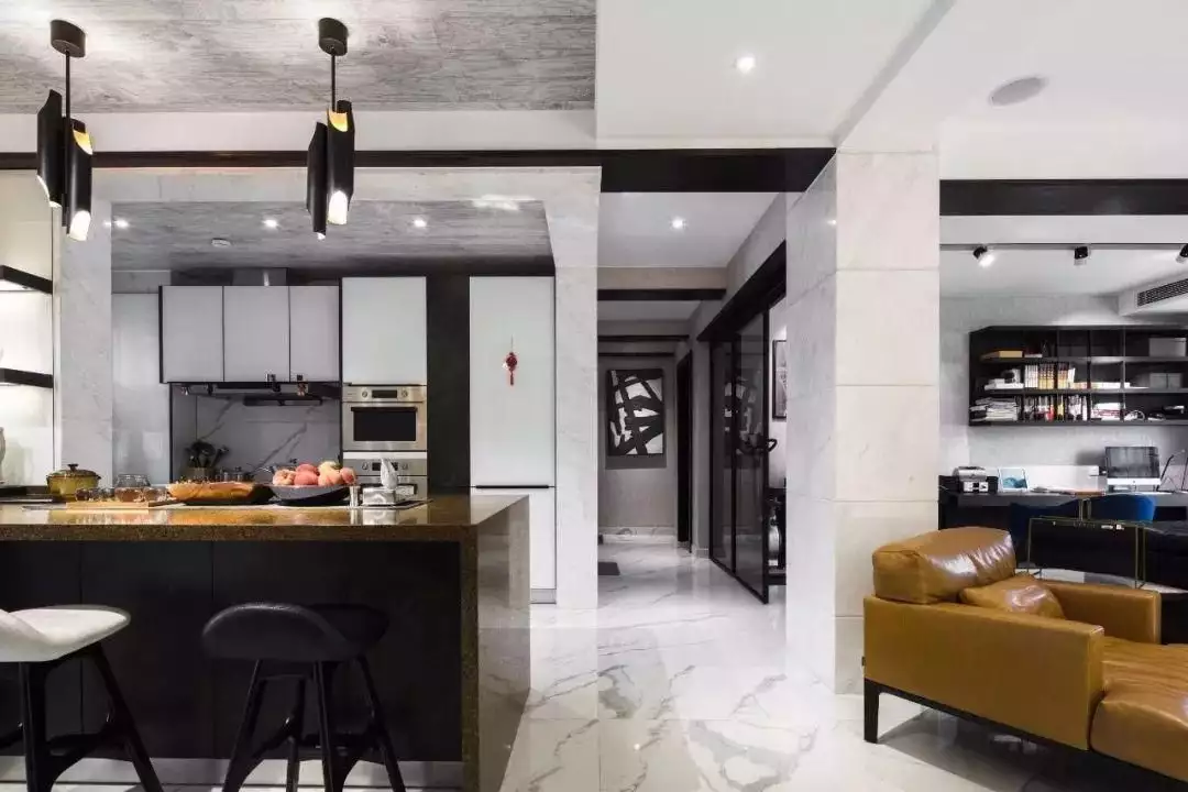 ▲黑白配的吧椅组合,中岛台靠里侧还做了一个展示架,方便酒杯与装饰品的摆放,提升空间的档次感。