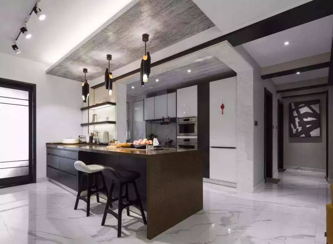 ▲中岛台上方天花以木饰面装饰,装一排吊灯,中岛台上摆上精致果盘餐具;右边是厨房空间,雅白地砖+浅灰色桑拿板天花,装上白色橱柜+嵌入式电器,整个餐厨空间显得时尚优雅而实用方便。