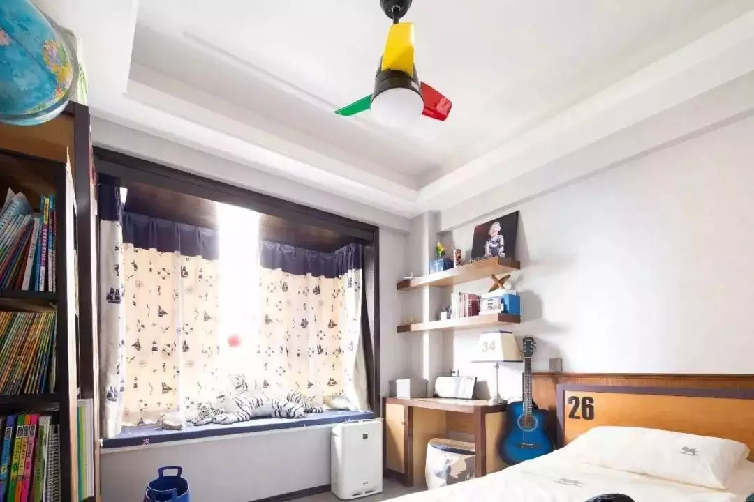 ▲儿童房在飘窗两侧分别设置书架与书桌,中间的窗帘是海洋主题,结合彩色风扇灯,让空间显得童趣而活泼。