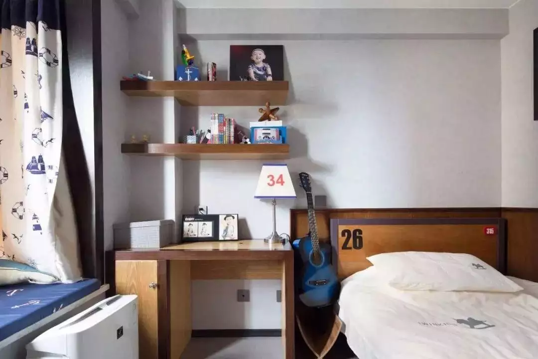 ▲书桌与床铺无缝衔接,床头柜摆上吉他,书桌上方的书架摆上书本、笔筒与婴儿时期的照片,也让儿童房充满回忆感。